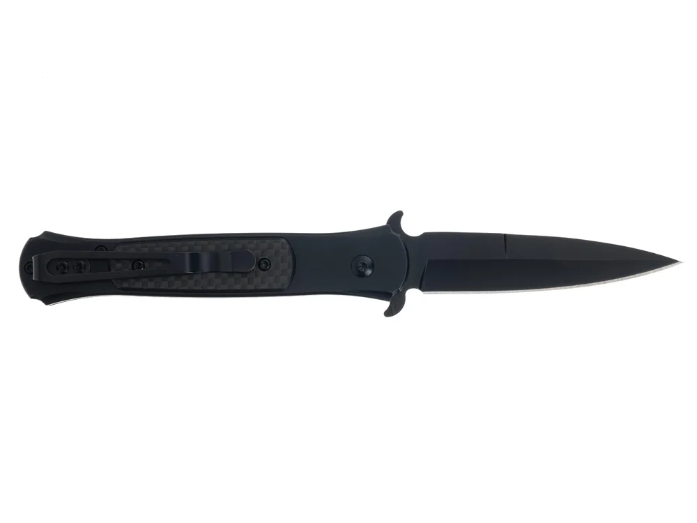 Рукоять ножа изготовлена из нержавеющей стали с накладками из карбона (углепластика) – это полимерный материал с композитным составом, изготовленный из переплетенных нитей углеродного волокна с использованием эпоксидных смол. Карбон является легким и исключительно прочным материалом, стойким к высоким температурам и агрессивным средам, отлично переносит влагу. Рукоять ножа собрана на втулках - бонках, поэтому при необходимости его можно легко промыть. На рукояти расположена съемная клипса для удобного размещения ножа в кармане. Нож мгновенно открывается и надежно фиксируется благодаря замку Button Lock. Дополнительные упоры на клинке могут выполнять функцию гарды, предотвращая соскальзывание руки на лезвие клинка.